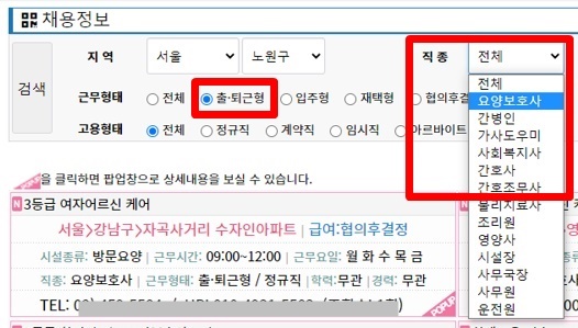 그러면 채용정보 화면을 보실 수 있는데요. 우선 여러분이 원하시는 지역과 구/군을 선택하시고 직종을 눌러서 요양보호사를 선택해주십니다. 저는 서울 / 노원구 / 요양보호사 / 출퇴근형 / 고용형태 : 전체로 검색을 했습니다.