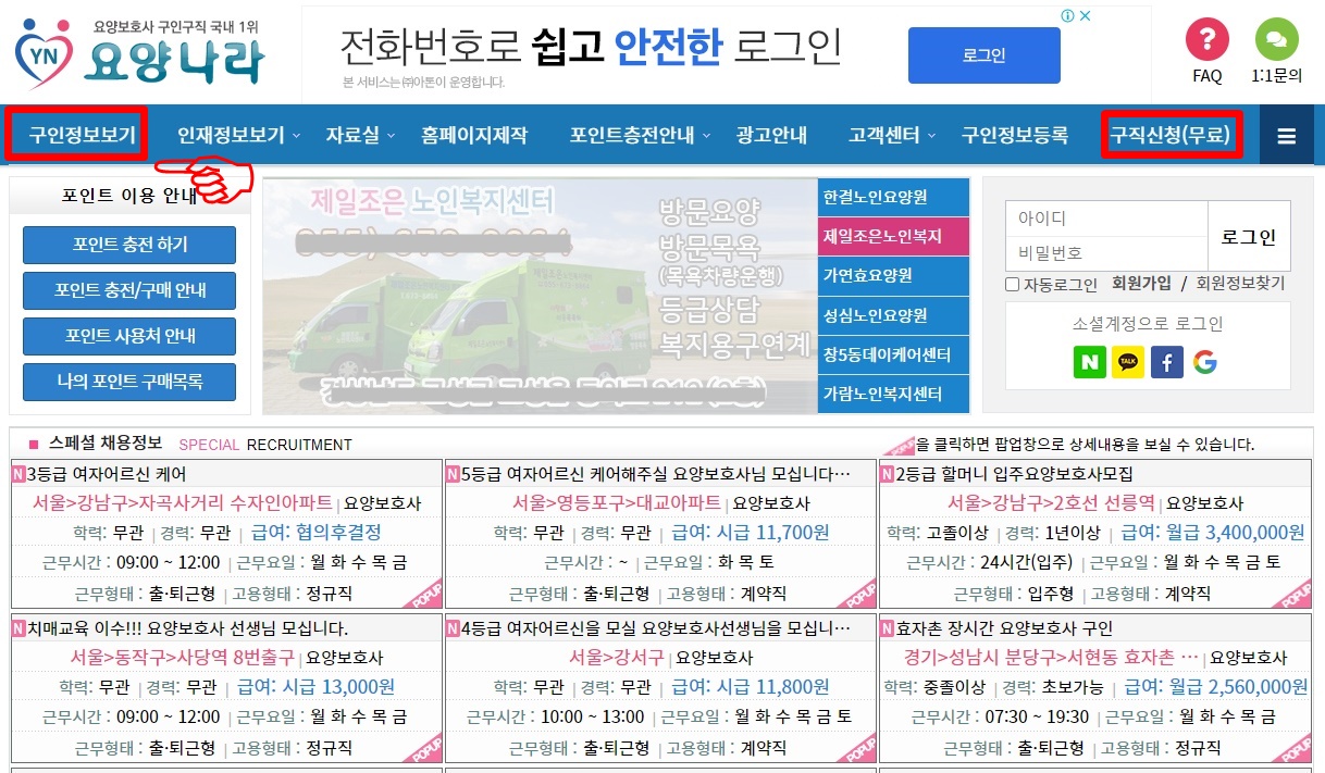우선 요양나라 사이트에 접속하시면 위와 같이 화면이 나오는데요. 맨 위에 왼쪽에 있는 구인정보 보기를 눌러주시기 바랍니다.