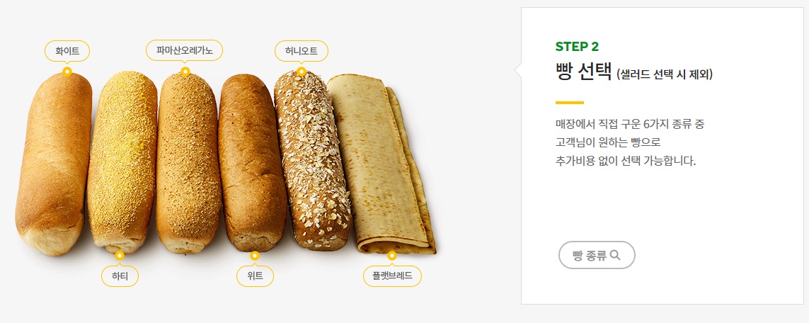 그리고 다음 순서로 빵을 선택하시면 됩니다. 샌드위치 전문점답게 빵 종류도 6가지로 정말 다양한데요.