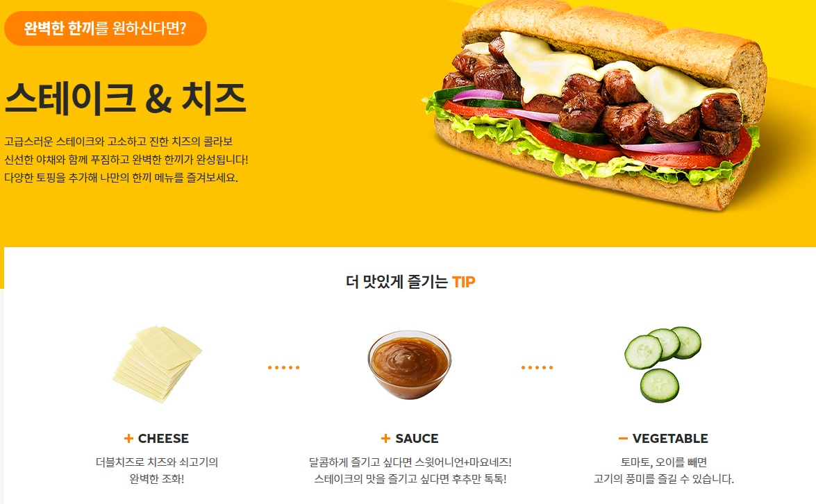 -스테이크&치즈 : 육즙이 쫙~풍부한 비프스테이크의 풍미가 입안 한가득 (사우스웨스트 치폴레, 스모크 바비큐 추천)