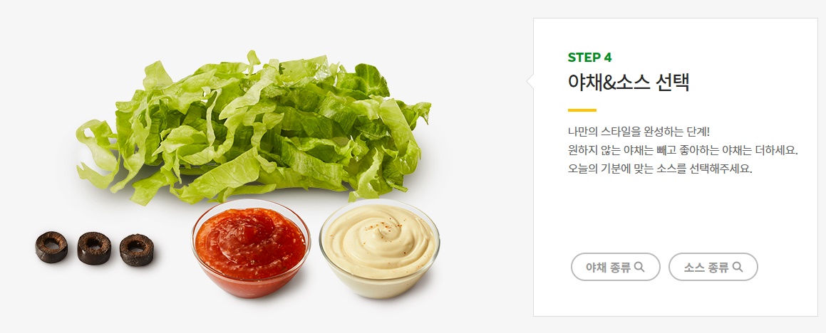 그러고 나서 어울리는 소스를 2가지 선택하시면 되는데요. 잘 모르시겠으면 직원분에게 가장 많이 선택하는 어울리는 소스로 해달라고 하시면 알아서 해주실 겁니다.