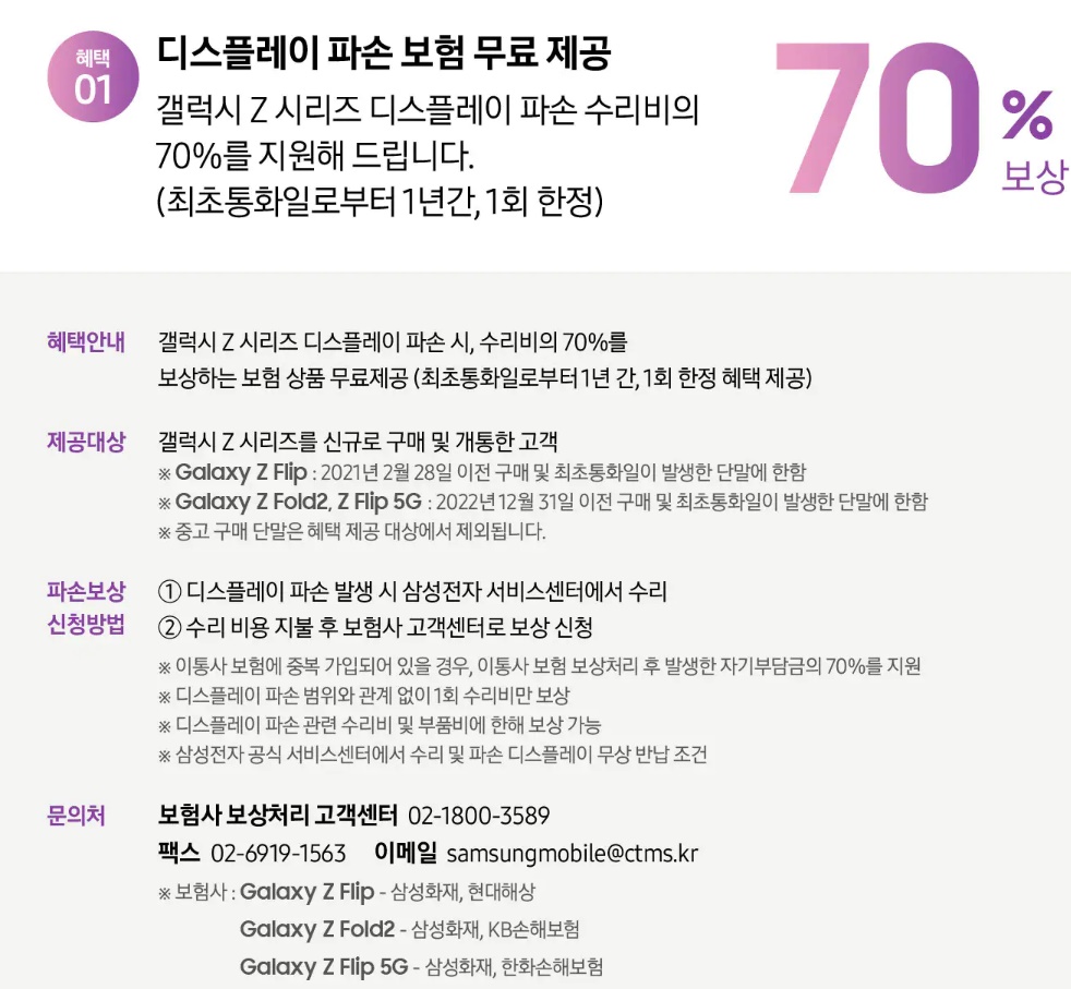 다행인 점은 폴드 시리즈, Z플립 디스플레이 파손 시 수리비의 70%를 보상하는 보험혜택이 적용(최초 통화일로부터 1년간, 1회 한정 제공)된다고 하니 자세한 내용은 아래에 보험혜택 관련해서 홈페이지를 참조하시기 바랍니다.
