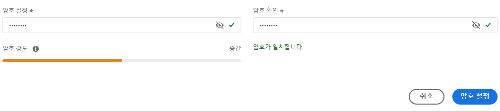 그렇게 암호설정이 되면 아래쪽에 빨간색, 노란색, 초록생 등 암호강도가 같이 표시가 되는데요. 노란색정도 되야 안전하게 보호를 할 수 있다고 생각합니다.