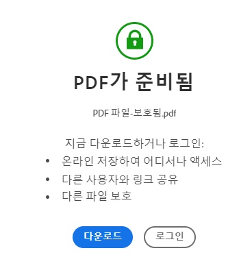 비밀버호 설정이 완료되면 위에처럼 PDF가 준비됨 이라고 뜨는데요. 아래쪽에 파란색 다운로드 버튼을 누르시면 여러분이 비밀번호를 설정한 PDF 파일이 다운로드 됩니다.