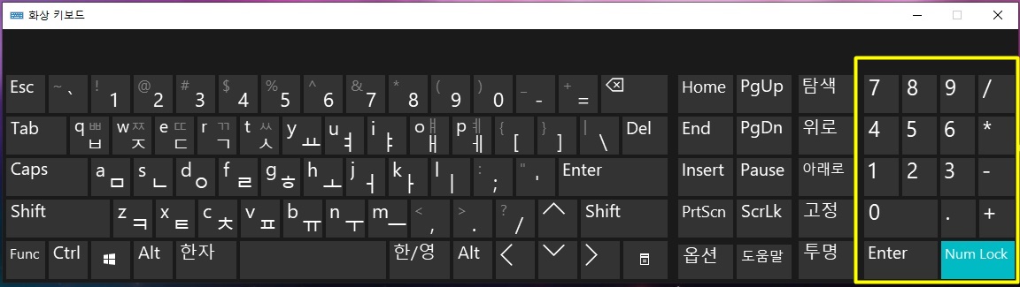 마지막으로 가상키보드를 사용해서 숫자를 넣으시는 일이 많을경우에는 위에 숫자버튼을 누르기 보다는 키보드 오른쪽에 붙어있는 계산기 숫자키보드가 필요하실 때가 있으실겁니다.