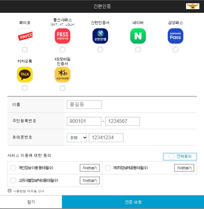 간편인증을 필요하신것으로 선택하시고, 아래쪽에 여러분의 성함과 주민등록번호, 휴대폰 번호를 입력하시고 서비스이용에 대한 동의 "전체동의"를 클릭하시고 맨 아래에 "인증요청" 버튼을 눌러주시면 됩니다.