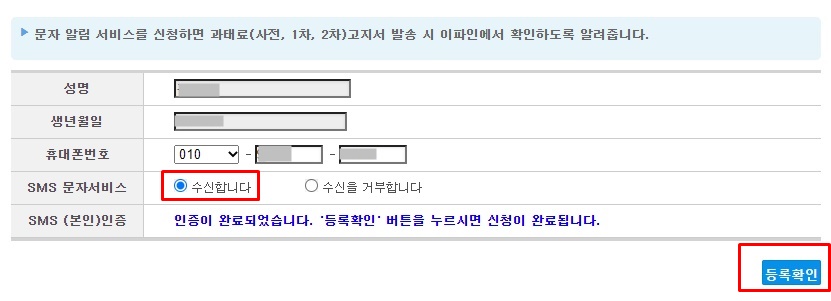 그러면 아래와 같이 인증이 완료되고, 맨 아래쪽에 등록확인 버튼을 눌러주시면 무인단속카메라 신호, 속도위반 단속 문자알림 서비스 신청이 완료됩니다.