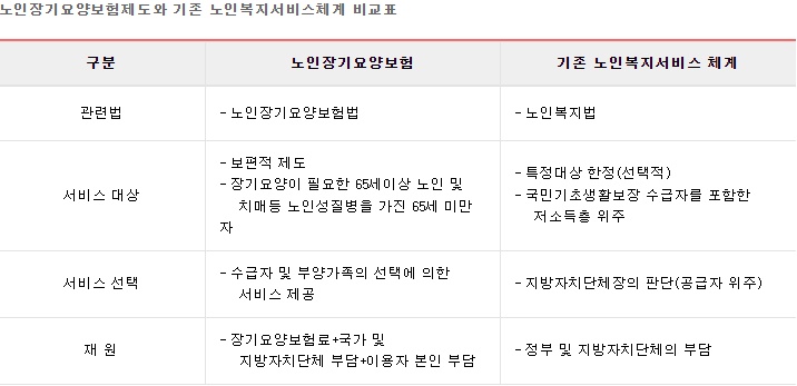 기존 노인요양은 주로 국민기초생활보장 수급자 등 특정 저소득층을 대상으로 국가나 지방자치단체가 제공하는 서비스 위주로 운영되어 왔으나, 「노인장기요양보험법」 상 서비스는 소득에 관계없이 심신기능 상태를 고려한 요양 필요도에 따라 장기요양인정을 받은 자에게 서비스가 제공되어 보편적인 체계로 운영되고 있습니다.