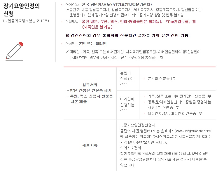 ※ 장기요양인정 신청자격 : 장기요양보험 가입자 및 그 피부양자 또는 의료급여 수급권자 중 65세 이상의 노인 또는 65세 미만인 자로서 치매, 뇌혈관성 질환 등 노인성 질병을 가진 자. 단 장애인은 제외됨.
