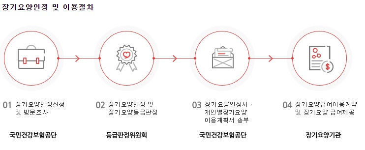 노인장기요양 인정 절차는 우선 건강관리공단에 장기요양인정 신청부터 시작해서 건강관리 공단 직원의 인정 절차를 위한 방문을 통해 장기요양 인정조사와 등급판정위원회의 등급판정 그리고 장기요양 인정서와 개인별 장기요양 이용계획서 작성 및 송부로 이루어진다고 합니다.