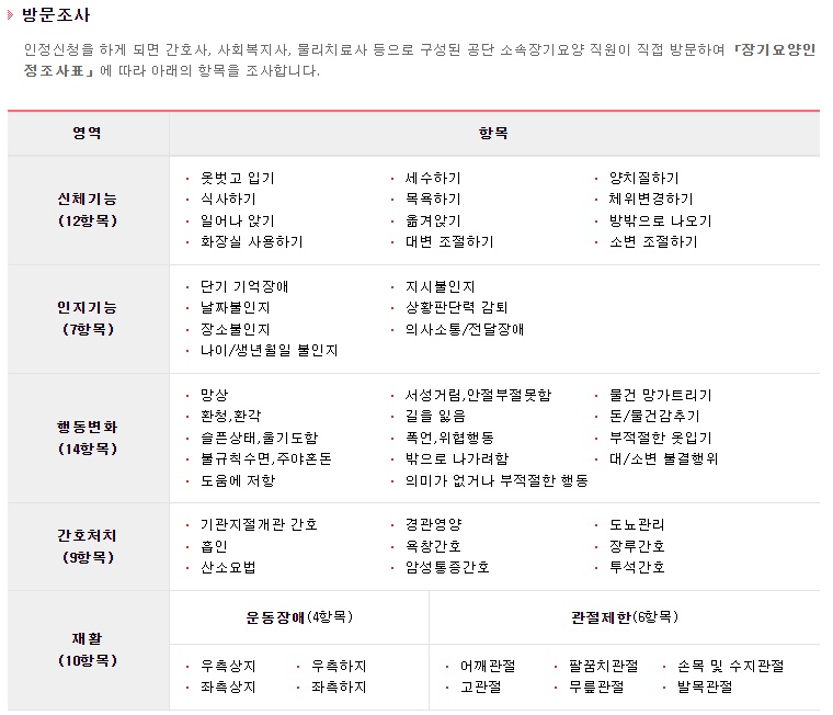 등급판정은 방문하여 "건강이 매우 안 좋다", "큰 병에 걸렸다." 등과 같은 주관적인 개념이 아닌 "심신의 기능상태에 따라 일상생활에서 도움(장기요양)이 얼마나 필요한지를 지표 화한 장기요양인정점수를 기준으로 하고 있습니다. 장기요양인정점수를 기준으로 다음과 같은 6개 등급으로 등급판정을 진행하고 있는데요.