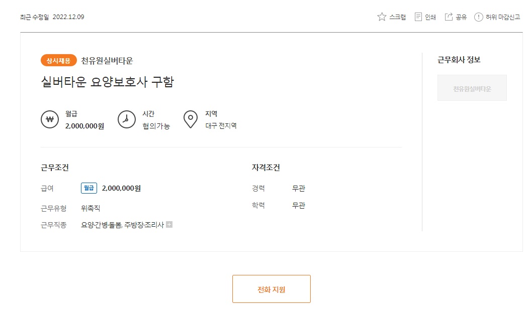 요양보호사를 구하는것이라 아마도 요양보호사 자격증은 있으셔야 지원이나 업무가 가능하실겁니다.