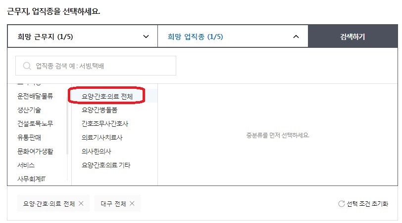 여러분이 알아보고자 하시는 구인구직 업직종을 선택-선택 하시고 오른쪽에 검정색 "검색하기" 버튼을 눌러주시면 됩니다.