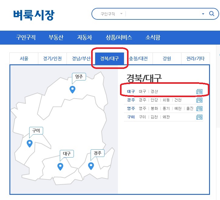 여기서 경북/대구 지역을 클릭하신 후 오른쪽에 지역을 선택해주시면 됩니다.