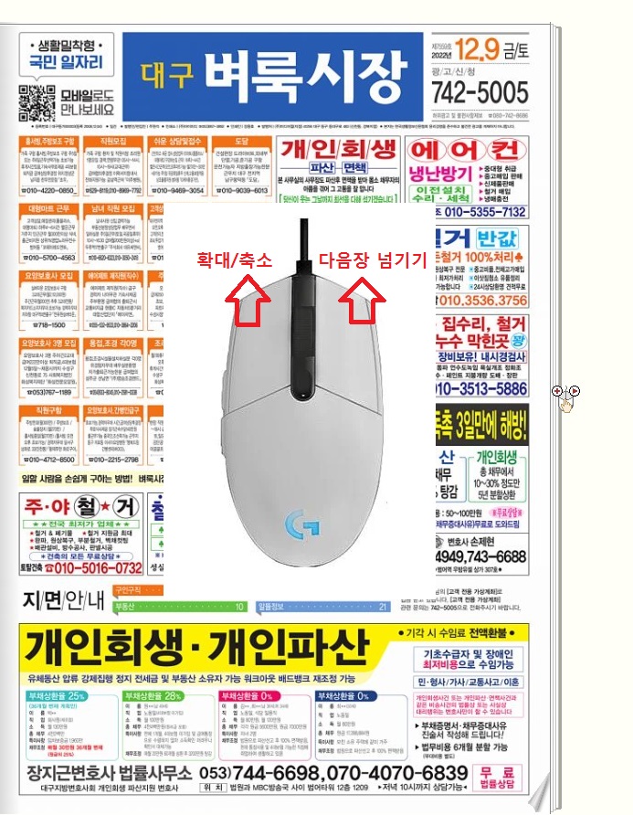 마우스로 신문을 넘겨보시고 돋보기로도 글씨가 작아서 안보이시는 분들은 클릭해서 확대/축소로 일자리 정보를 찾아보실 수 있으십니다.