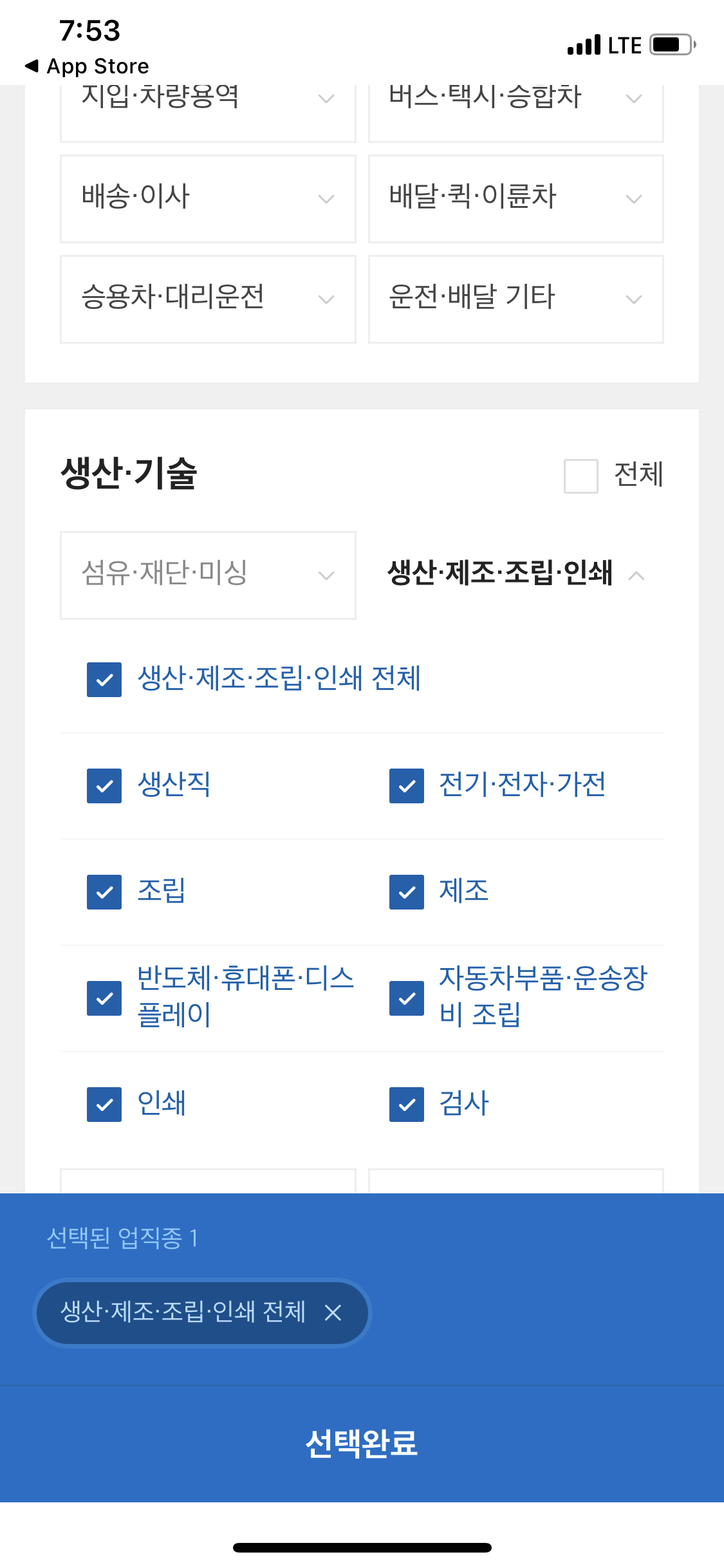 그런다음 희망업직종은 생산 제조 조립을 눌러 제가 알아보고 싶은 생산직에 대해서 검색해 보겠습니다.