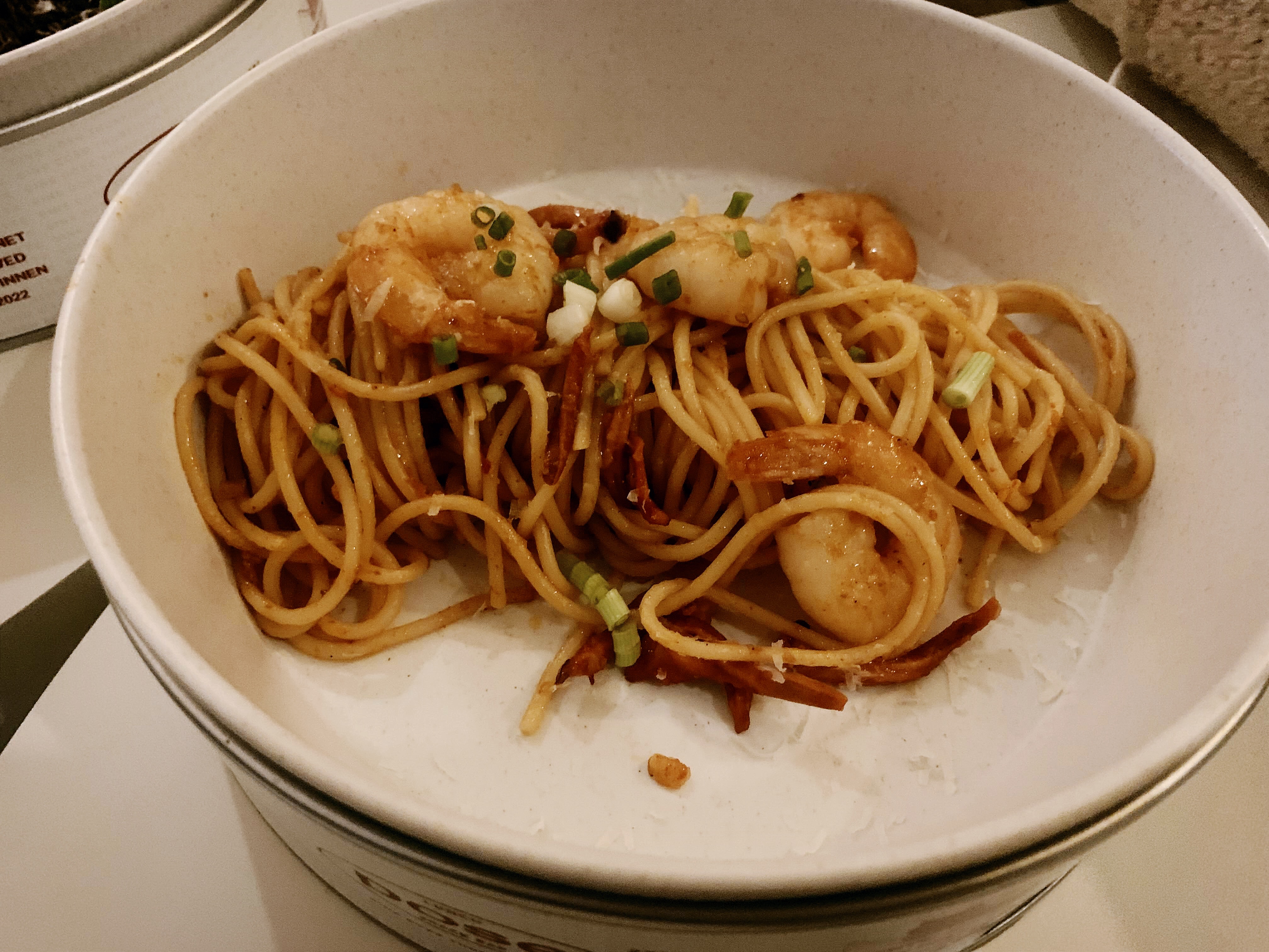 다음으로 안주겸 저녁식사겸해서 오징어 젓갈 파스타를 하나 시켜보았는데요. 큰 새우도 5-6마리 정도 들어가 있고 매콤해서 먹기 좋았습니다.