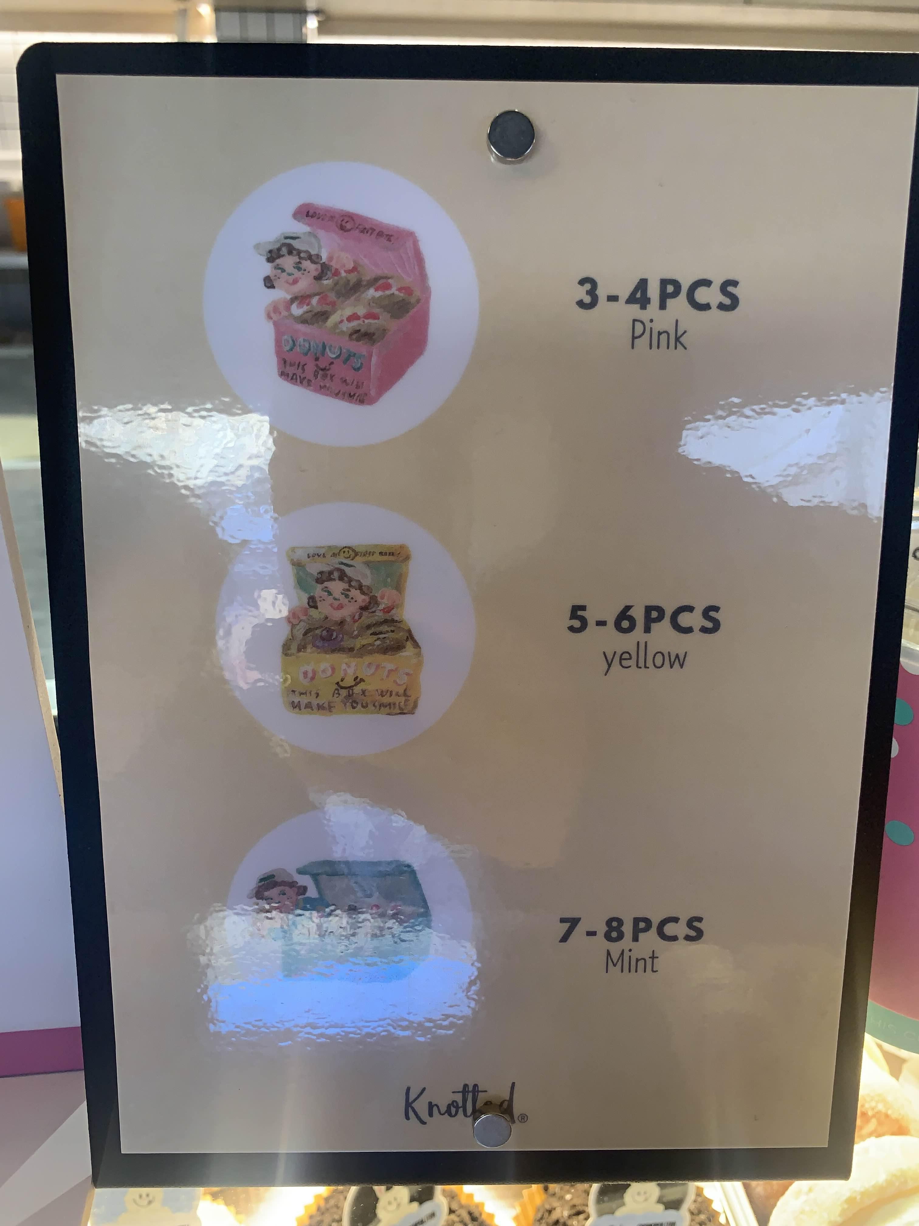 노티드도넛 박스 포장은 3-4개 단위, 5-6개 단위, 7-8개 단위로 되어있구요. 박스는 300원 정도 추가로 나옵니다. 박스디자인도 상당히 귀여워서 연말에 친구들에게 노티드 도넛을 선물로도 많이 하실거 같더라구요.