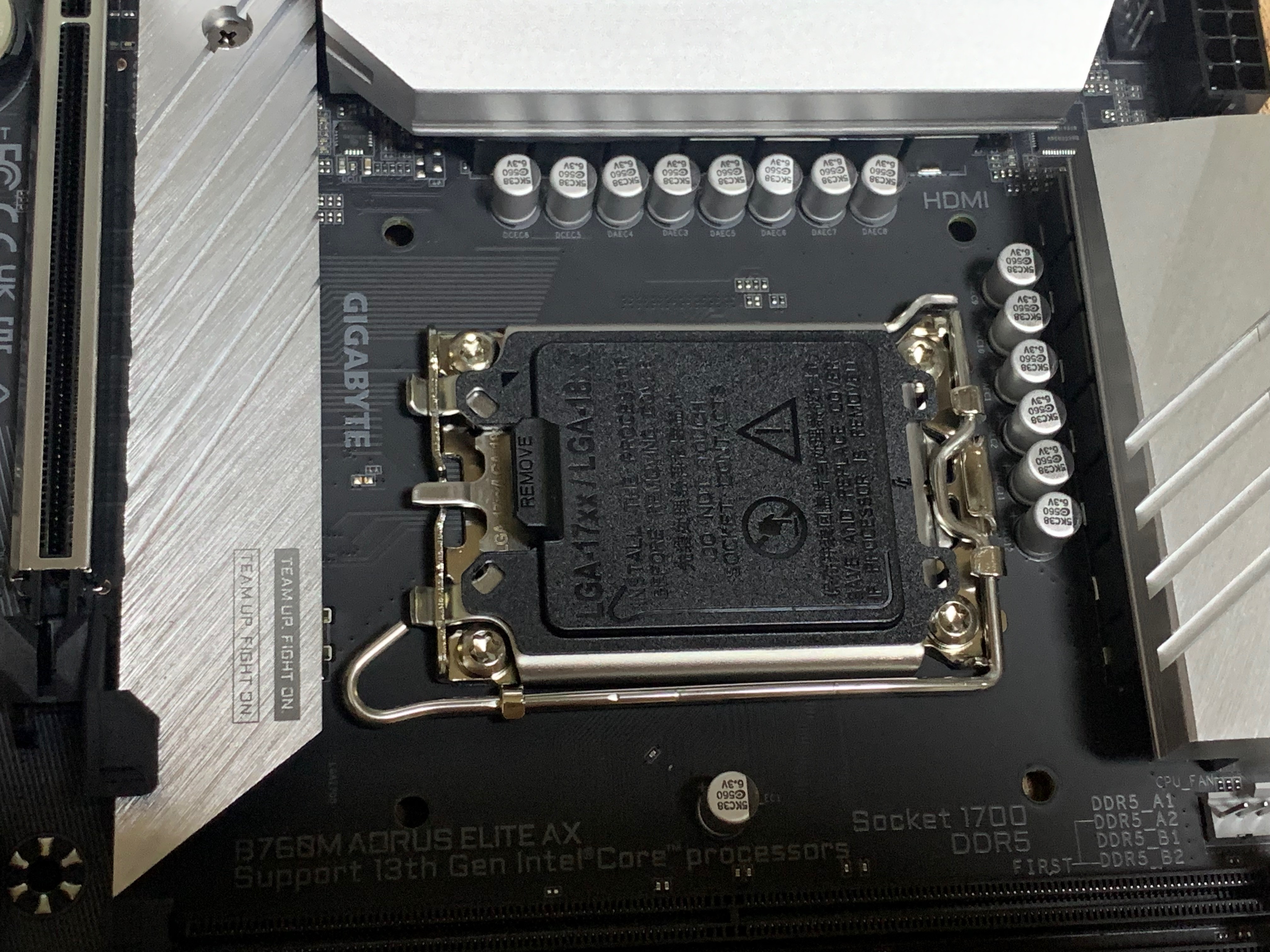 메인보드에 중앙에 자리잡은 cpu슬롯입니다. 양옆으로 방열판들이 깔끔하게 자리를 잡고 있네요.