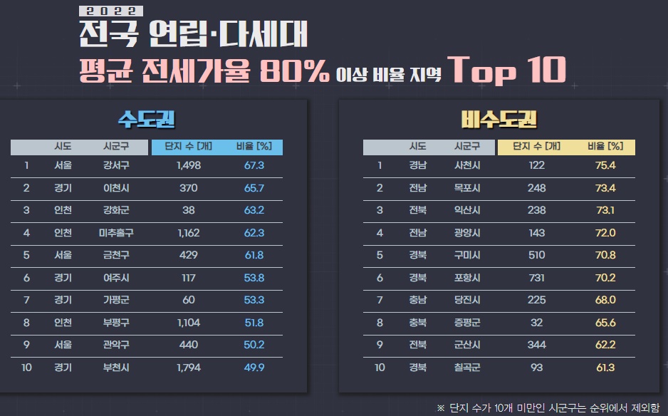 전국아파트, 연립 다세대 전세가율 80%이상인 지역 상위 10위도 올려두었습니다.
