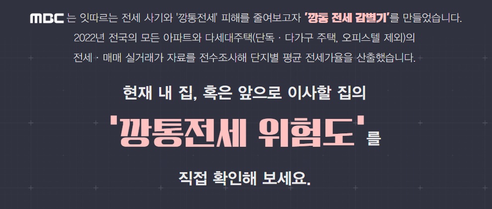 이런 와중에 MBC 탐사취재팀이 이런 악순환의 고리를 조금이나마 끊어보고자 MBC 전국 깡통전세 감별기 사이트를 만들었다고 합니다.
