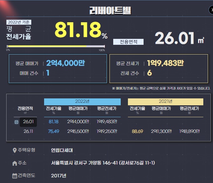 이곳은 평균 전세가율이 81%나 되는 높은 연립 다세대 주택이네요. 건축연도가 17년도라 이제 6년이 되가는 신축빌라로 보입니다. 매매건수도 많지 않아서 전세가율을 논하기엔 어려움이 있으니 참고만 하시기 바랍니다.