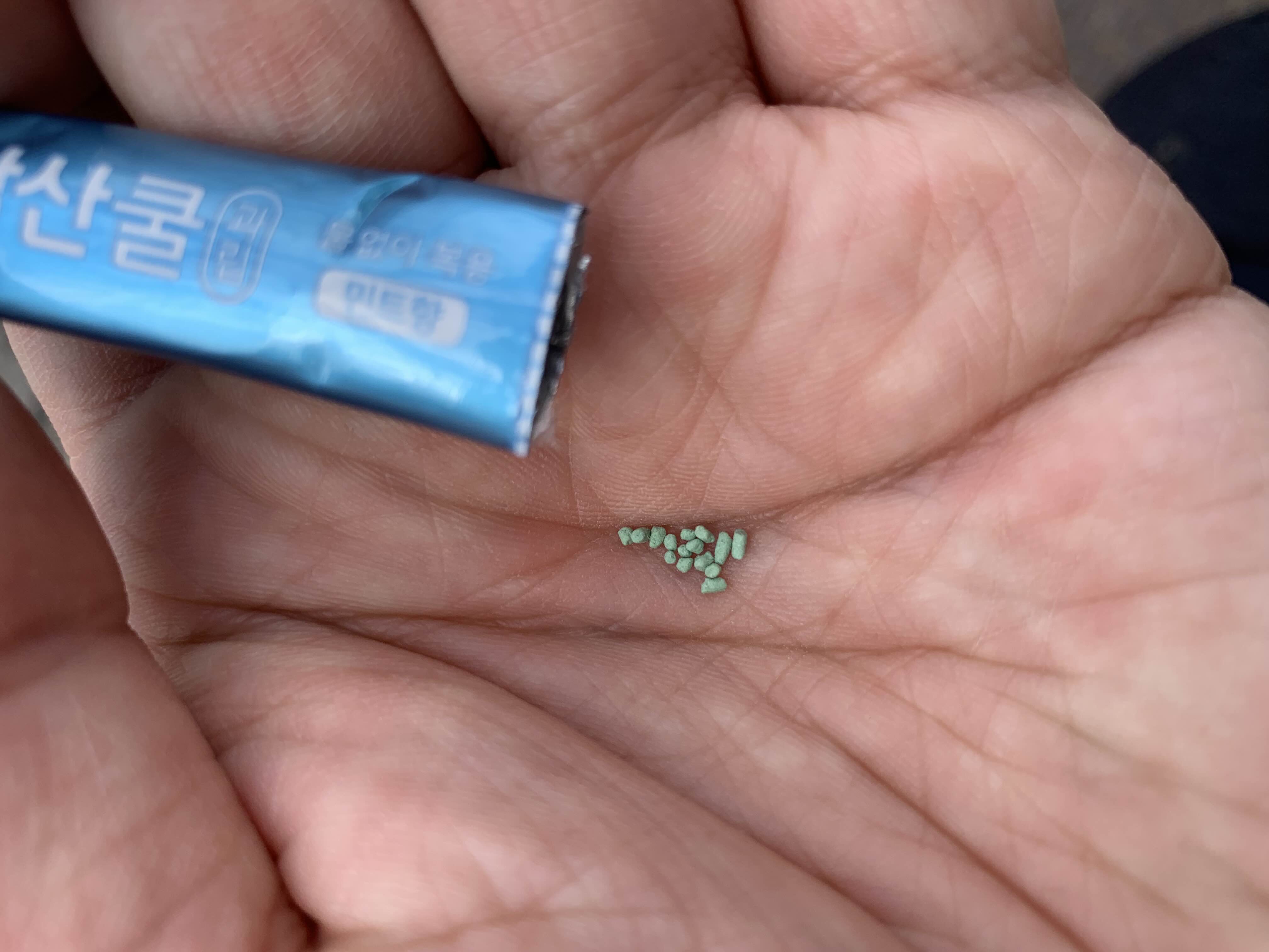 자르는선을 따라 자르면 이렇게 되어있는게 나와있습니다.제가 사진찍으려도 조금만 손에다가 털어봤는데요. 정말 작은 알갱이로 되어있어서 목에서 걸리거나 하지 않을거 같네요.