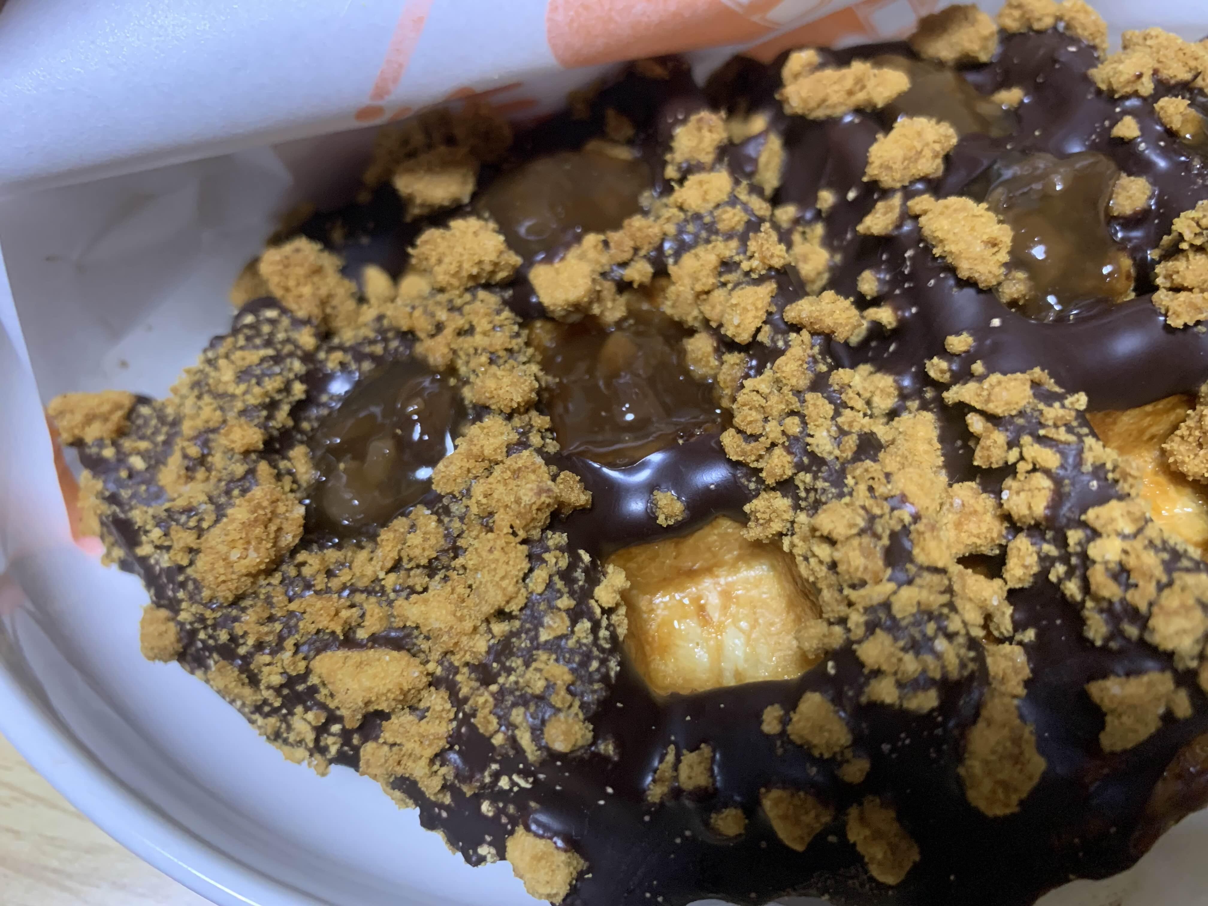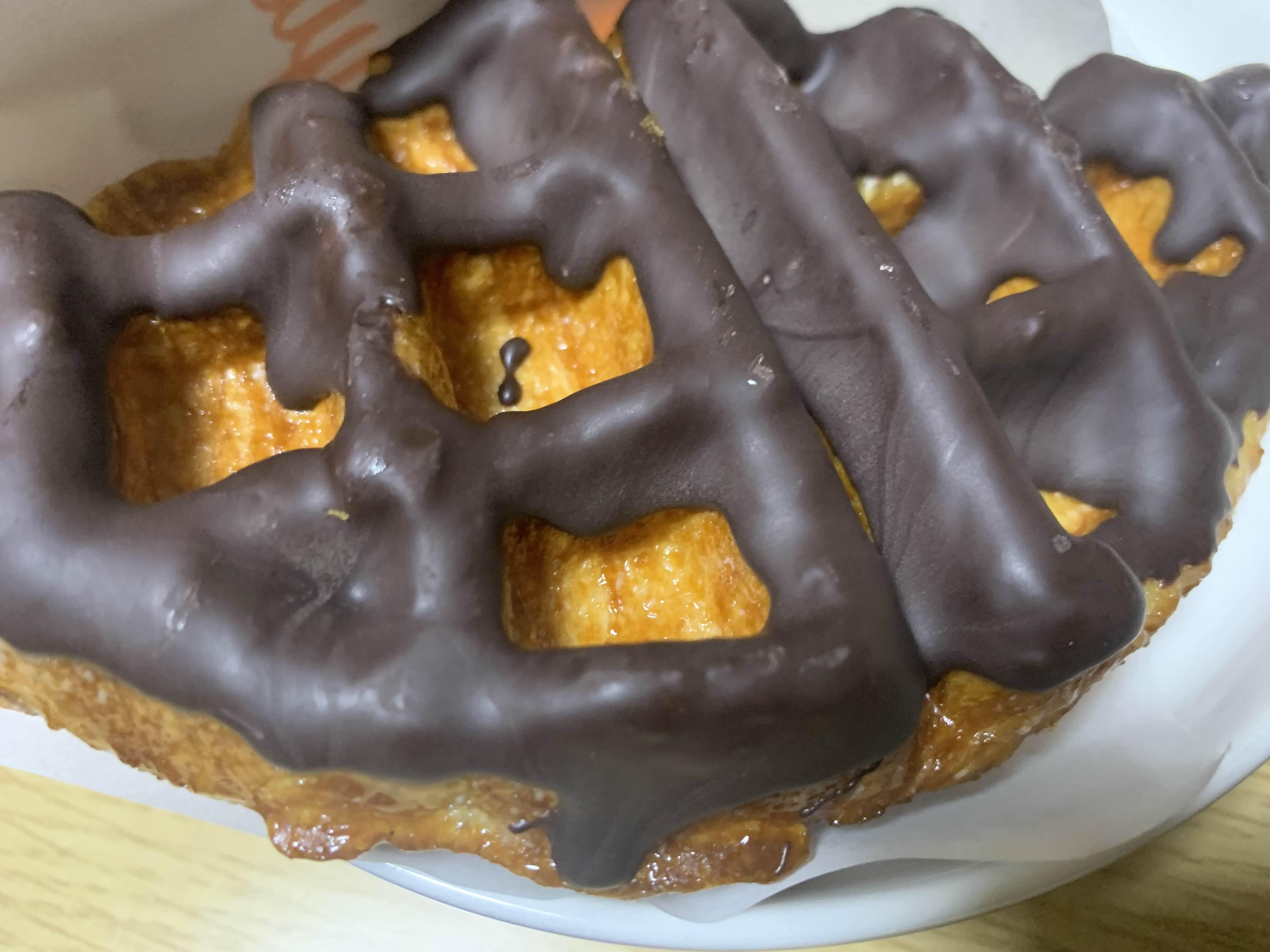 기본 크로플위에 초코시럽이 묻어있고 그위에 크런키와 중간중간에 달달한 호박 시럽이 들어가 있는 메뉴입니다.