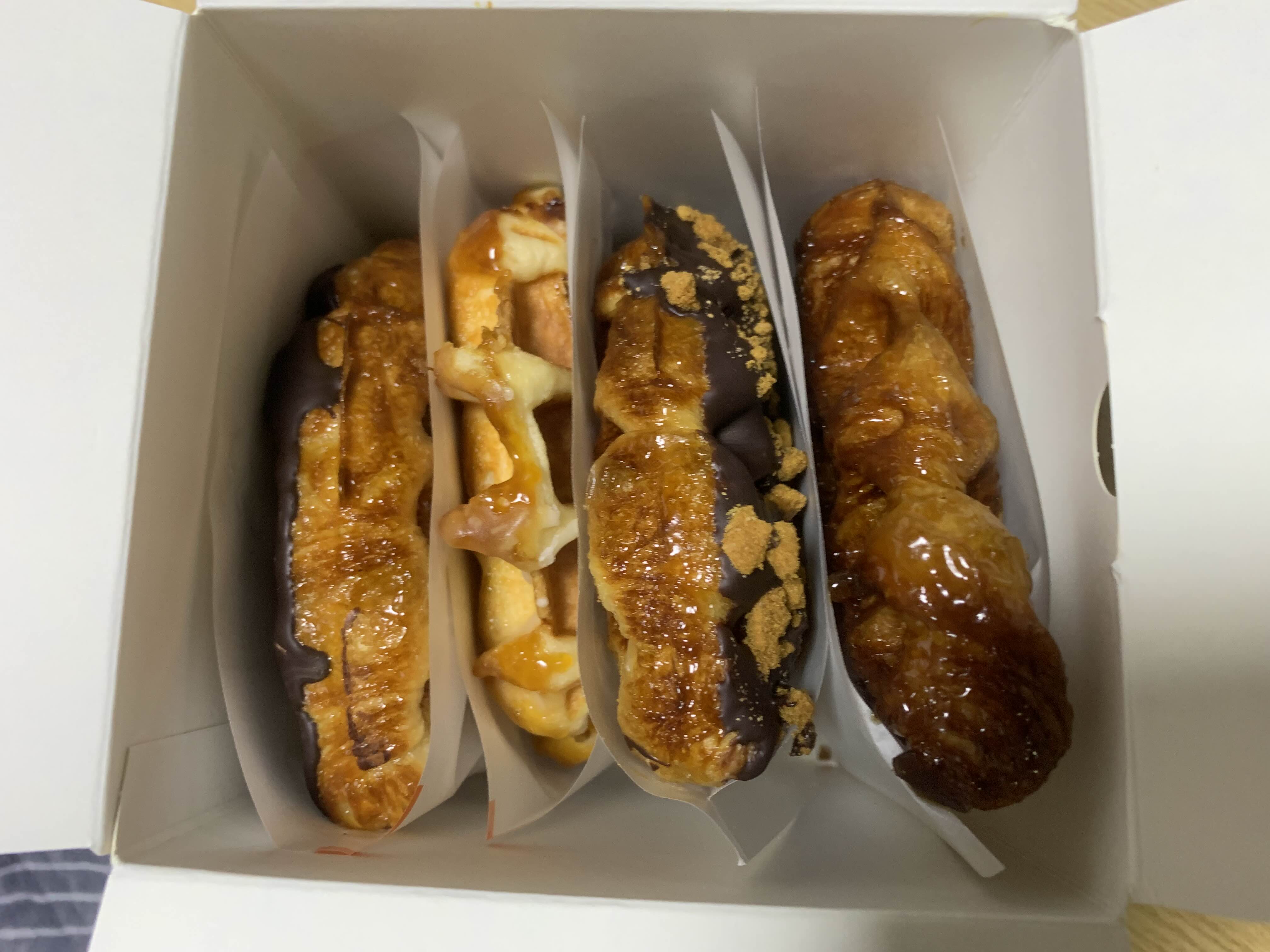 왼쪽부터 초코크로플 오리지널크로플 펌킨초코크로플 글레이즈와플 이렇게 구매해봤어요.